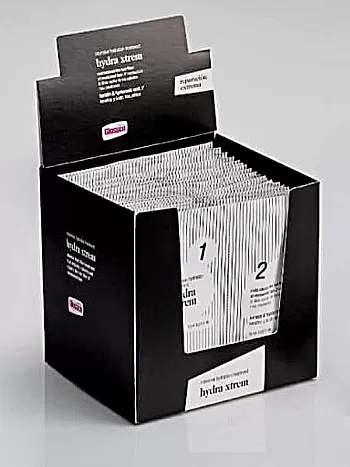 Glossco Hydra Xtrem on kaksivaiheinen tehohoito, joka palauttaa kosteuden ja elinvoiman erittäin kuiville tai vaurioituneille hiuksille. Hoidon kaksi vaihetta sekoitetaan keskenään ennen käyttöä ja levitetään kosteisiin hiuksiin.